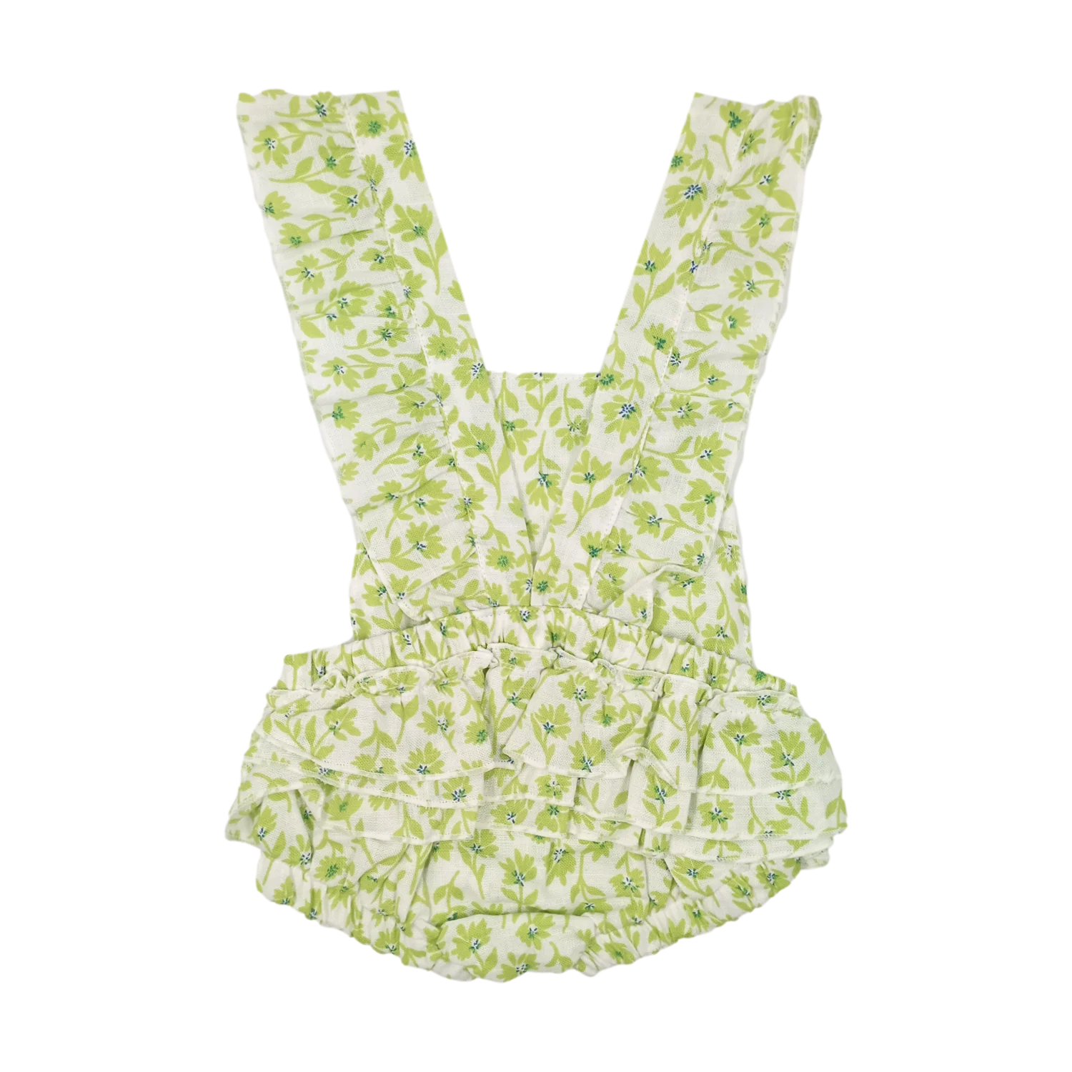 Hermoso asoleador tipo body en la parte inferior para facilitar el cambio de prenda, tirantes con volantes decorativos y escote trasero. Elaborado en algodón para mayor frescura para tu pequeña.
