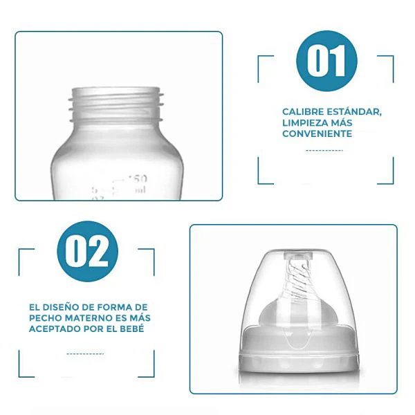 Incluye biberón: el pezón ancho y en forma de seno hace que sea fácil combinar la lactancia y el biberón. La forma y el tacto del pezón imitan el seno, lo que facilita la transición de la lactancia materna al biberón.