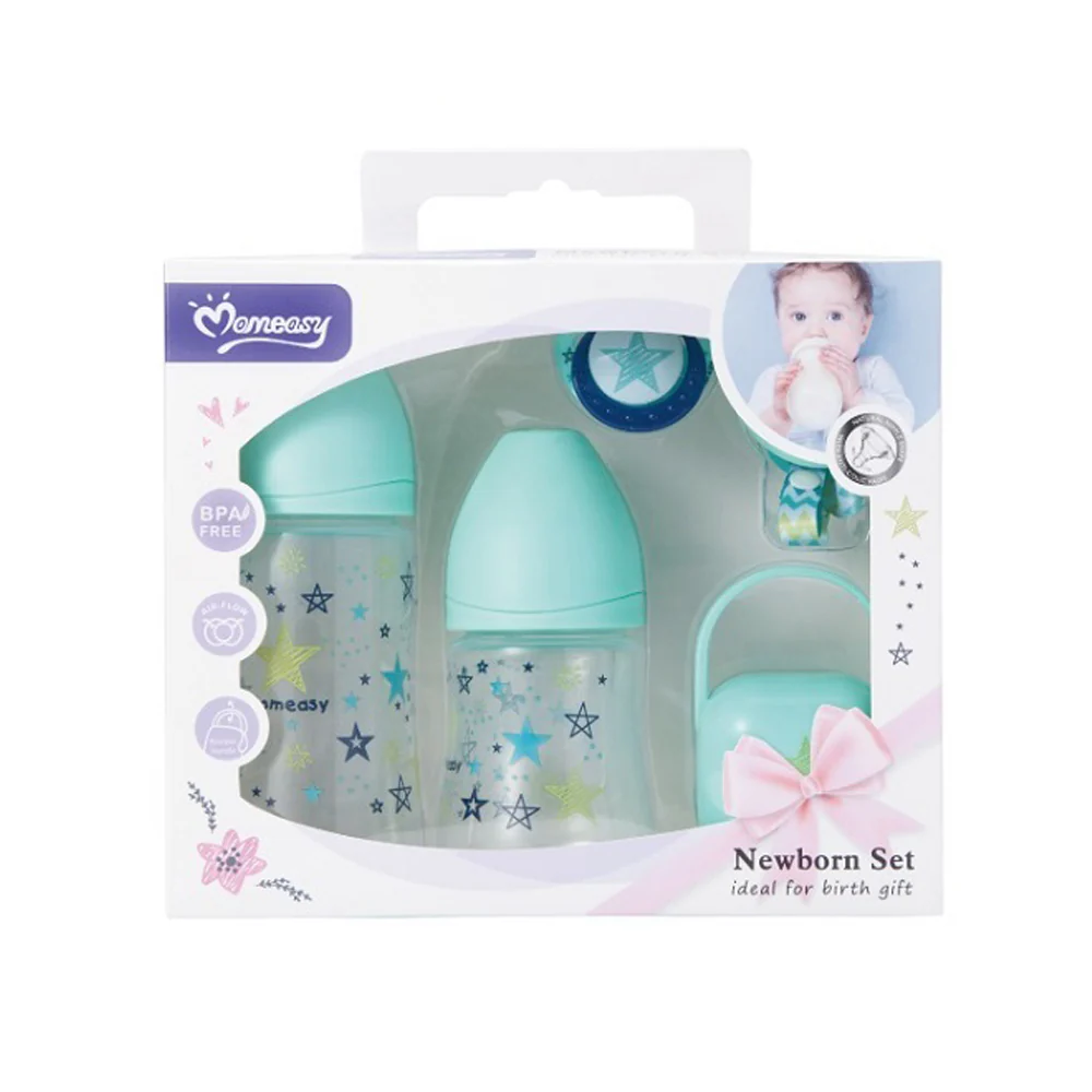 El kit tetero contiene 2 biberones para cada una de las etapas de alimentación del bebé, adicional varios accesorios: pezones de silicona, chupetes ortodónticos de silicona con sistema de ventilación que reduce la irritación de la piel, sostenedor de chupetes que evita las caídas y una caja portachupetes.