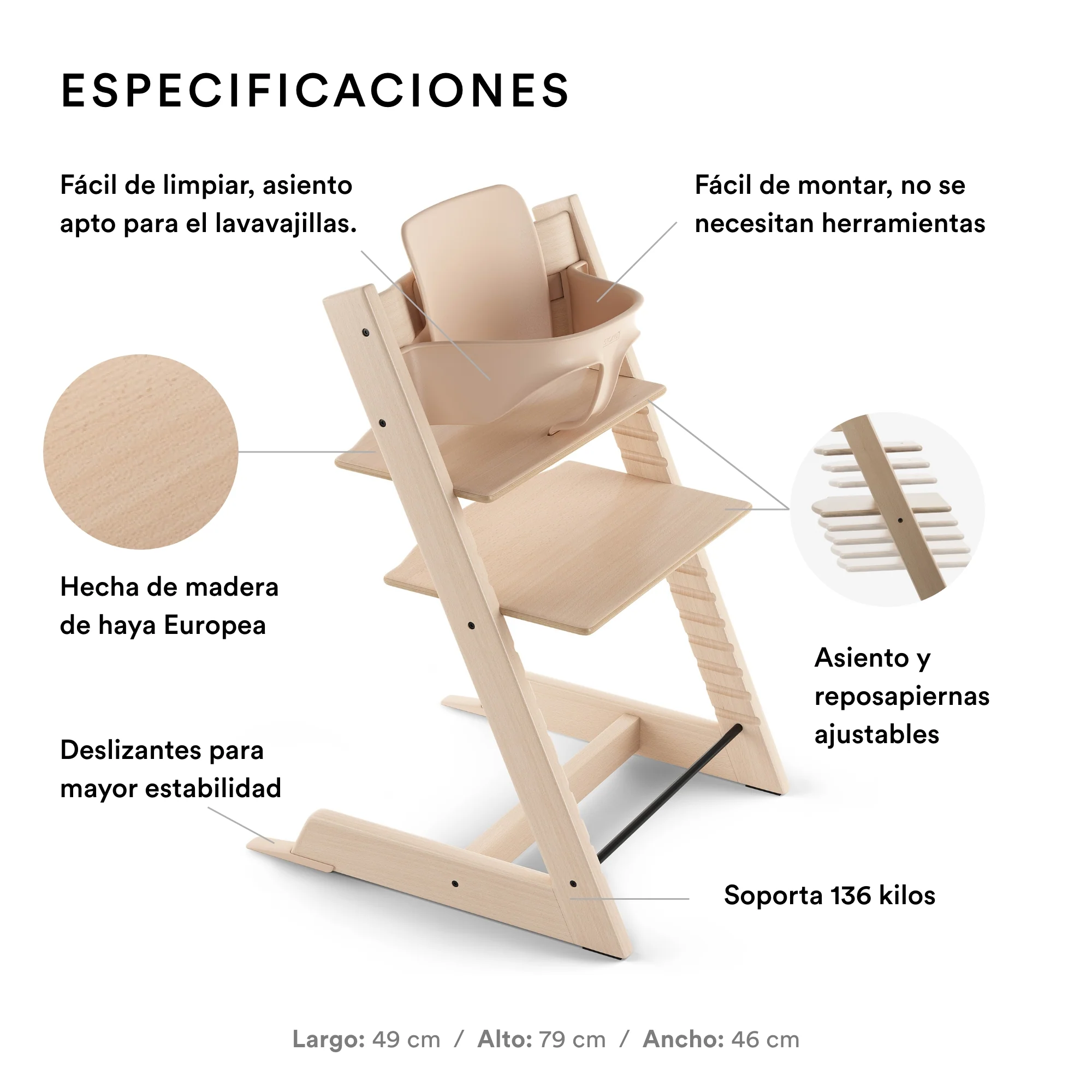 ATEMPORAL y AJUSTABLE – Con un asiento y reposapiés ajustables, Tripp Trapp permite la libertad de movimiento. Además, está disponible en una amplia gama de colores y dos acabados de madera, para dar un aspecto ideal a cualquier ambiente.