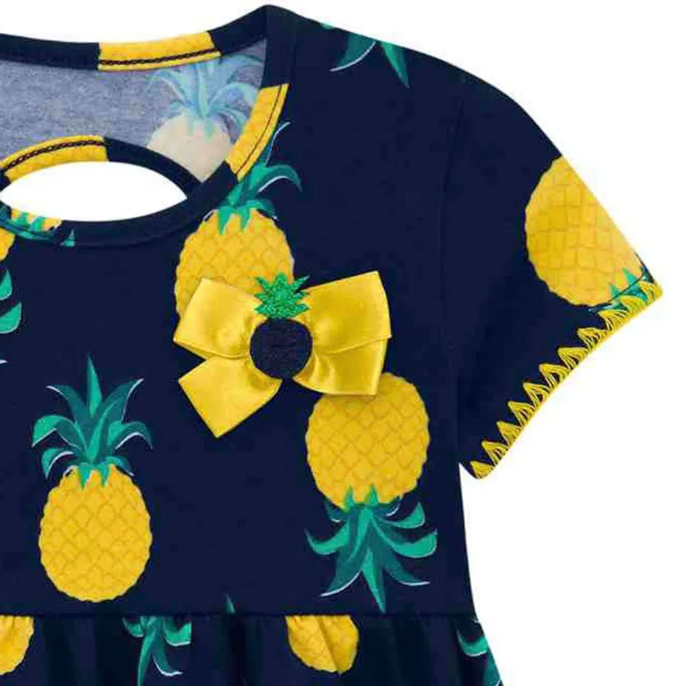 Vestido Infantil Kyly confeccionado en Algodón , presenta falda con volante dejando la pieza suelta, estampado neón con aplicación de lazo de grosgrain rotatorio a la altura del pecho y tirantes en forma de X en la espalda.